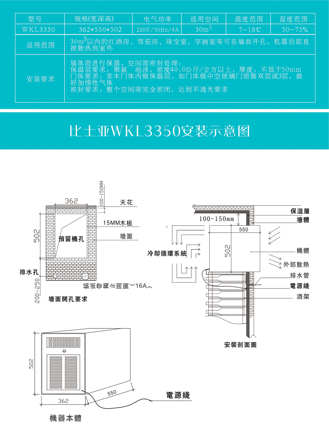 比士亞/比利澤WKL3350(一體機(jī))美國原裝進(jìn)口酒窖空調(diào),適用于30立方米以內(nèi)經(jīng)過做保溫隔熱處理的空間,使酒窖內(nèi)保持溫度恒定在:7-18℃(可調(diào)中間任意溫度)濕度恒定在55-75%