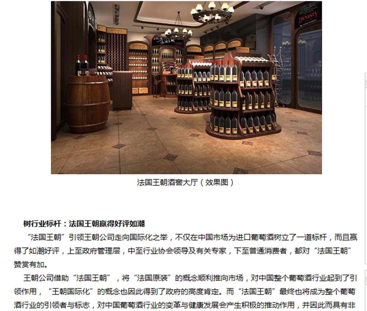 客戶名稱: 江蘇蘇州皇朝酒業(yè) 項(xiàng)目地址: 江蘇蘇州皇朝酒業(yè)旗艦店 設(shè)計(jì)公司: 項(xiàng)目簡(jiǎn)介: 中法合營(yíng)王朝葡萄釀酒有限公司始建于1980年,是我國(guó)制造業(yè)第一家中外合資企業(yè),合資的外方為世界著名的法國(guó)人頭馬集團(tuán)亞太有限公司。2005年1月,公司在香港主板成功上市。企業(yè)投資總額為8.2億元人民幣,占地面積440畝 |