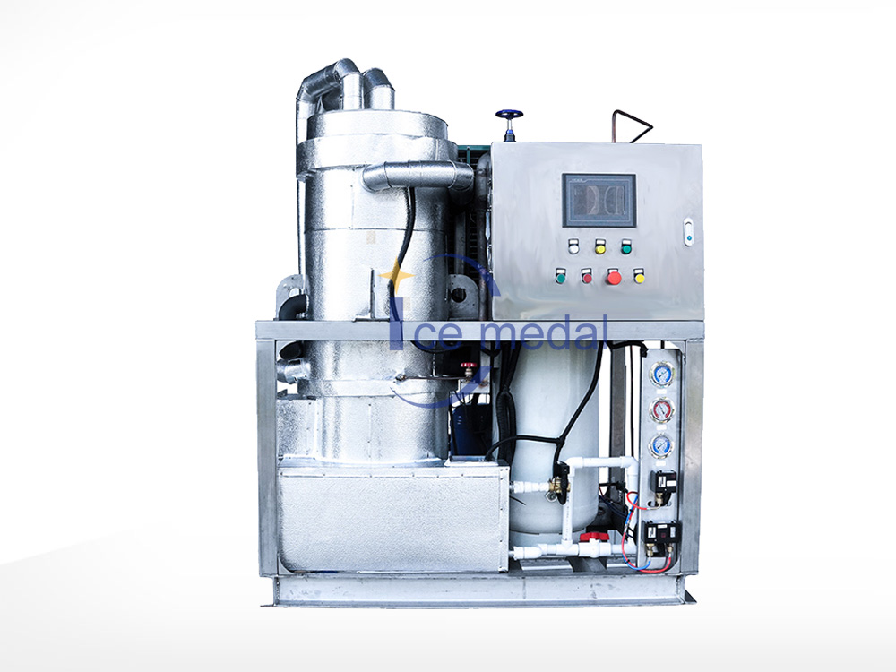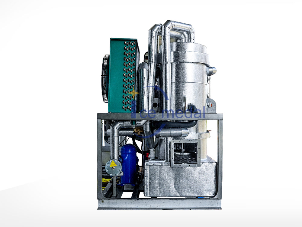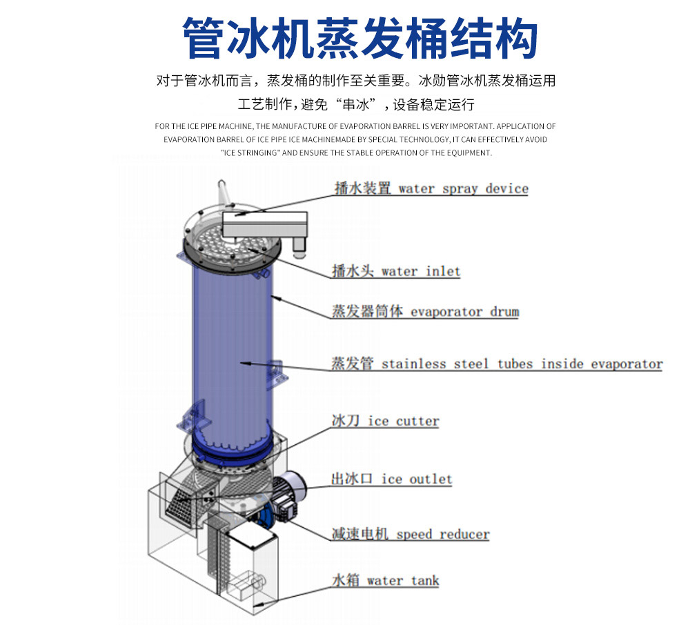 2、管冰機所有與制冰水接觸部分材質(zhì)均是食用級材料。 由多根不銹鋼管組成蒸發(fā)器制冷劑在管與管之間流動,水在管內(nèi)從上往下在分水器的作用下呈螺旋狀流動, 水在流動過程中形成冰。