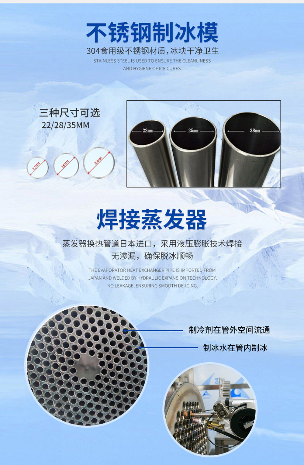 4、蒸發(fā)器換熱管道日本進口,采用液壓膨脹技術(shù)焊接, 無滲漏,確保脫冰順暢。