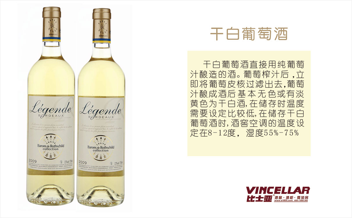 干白葡萄酒直接用純葡萄汁釀造的酒。葡萄榨汁后,立即將葡萄皮核過濾出去,葡萄汁釀成酒后基本無色或有淡黃色為干白酒,在儲存時溫度需要設(shè)定比較低,在儲存干白葡萄酒時,酒窖空調(diào)的溫度設(shè)定在8-12度