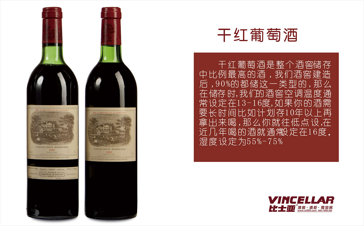 1.干紅葡萄酒 干紅葡萄酒是整個酒窖儲存中比例最高的酒,我們酒窖建造后,90%的都儲這一類型的,那么在儲存時,我們的酒窖空調(diào)溫度通常設(shè)定在13-16度,如果你的酒需要長時間比如冬計(jì)劃存10年以上再拿出來喝,那么你就往低點(diǎn)設(shè),在近幾年喝的酒就通常設(shè)定在16度