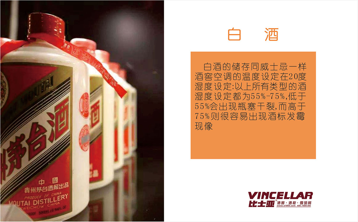 白酒的儲存同威士忌一樣,酒窖空調(diào)的溫度設(shè)定在20度 濕度設(shè)定:以上所有類型的酒,濕度設(shè)定都為55%-75%,低于55%會出現(xiàn)瓶塞干裂,而高于75%則很容易出現(xiàn)酒標(biāo)發(fā)霉現(xiàn)像