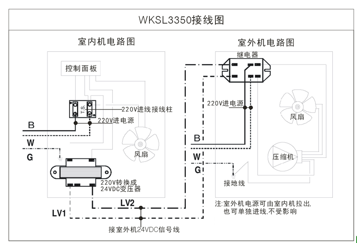 1.1工具清單: 序號 工具名 數(shù)量 備注 1 真空泵 1臺 建議使用帶加壓型的 2 銅管6# 按實際 銅管厚度不低于0.7m 3 銅管10# 按實際 銅管厚度不低于0.7m 4 2.5平方3芯電源線 按實際 請使用品牌通過CCC認(rèn)證 5 0.75平方3芯信號線 按實際 請使用品牌通過CCC認(rèn)證 6 制冷劑R134A 按實際 推薦用杜邦13.6KG裝的 7 接線端子 每臺機(jī)10個 8 3/16英制內(nèi)六角 1個 9 焊接用的工具輔料 1套 10 固定室外機(jī)用支架 1套 11 加注制冷劑工具 1套 12 溫濕度測量儀器 1個 二、酒窖空調(diào)安裝所需要的環(huán)境 1.21安放的位置必須是要進(jìn)行了防水處理。 1.22必須達(dá)到冷庫的保溫級級。 1.23進(jìn)出的門必須是密封保溫門。 三、酒窖空調(diào)內(nèi)外機(jī)的連接 使用6#和10#銅管,各一根以及信號線,電源線,從室內(nèi)鋪設(shè)到室外機(jī)安放位置,注意銅管總長不超過15米,每一個90度拐彎相對減少1米有效距離。 3.1焊接外機(jī) 將6#銅管,及10#銅管,對應(yīng)焊接好 3.2 焊接過濾器與示液鏡 隨機(jī)有配一個過濾器與示液鏡,具體的焊接方法是: 過濾器焊接在低壓管(大管)上,按過濾器上的箭頭方向,不能接反. 示液鏡焊接在高壓管(小管)上,沒有方向. 注意: 焊接時盡量焊接在外機(jī)的一側(cè),以便觀察及方便外機(jī)的上罩能順利蓋上 ![]() 示液鏡與過濾器 3.3焊接內(nèi)機(jī): 室內(nèi)機(jī)必須安放在酒窖距天花100-150MM位置,需要考慮出風(fēng)與進(jìn)風(fēng)能在酒窖中均勻,出風(fēng)口不能正對門,以防止冷氣過快跑出。 焊接方式,將銅管由機(jī)器背部后的孔穿過,按高低壓管對應(yīng)焊上,注意的是:焊接時要小心移動機(jī)器內(nèi)的銅管,防止內(nèi)部細(xì)小銅管打折或斷開,并且要注意保護(hù)好機(jī)器內(nèi)的保溫泡沫(用東西隔開再焊接) 3.4連接排水管 將排水管連接,鎖緊,自然方式排入出水口(建議用帶保溫性的彈性水管) 四、酒窖空調(diào)接線 電源線為3芯2.5平方,信號線為3芯1.5平方 4.1 焊接室內(nèi)機(jī)電源線及信號線 如下圖所示:對應(yīng)連接好。 ![]() 4.2 連接室外機(jī)電源線電信號線: 如下圖所示:對應(yīng)連接好。 說明:室內(nèi)機(jī)與室外機(jī)的電源線可以同是由室內(nèi)引出,室外機(jī)也可以單獨接電源,室外機(jī)是由室內(nèi)機(jī)信號進(jìn)行控制的。 ![]() 附圖:電路接線圖 ![]() 五,抽真空與加制冷劑 5.1排出氣體 因為機(jī)器是充氮氣運輸,所以必須排出原來的氮氣,需要準(zhǔn)備英制3/16的內(nèi)六角,扭開室外機(jī)的閥門,排出氣體. 5.2抽真空檢漏 抽取真空后打上壓力表,兩個小時或更長時間后再取表,查看是否有泄漏。 5.3加制冷劑 開機(jī)(檢查內(nèi)外機(jī)全部連接完好),緩慢加入制冷劑,檢查室內(nèi)機(jī)是否制冷:通常查看蒸發(fā)器上是否有掛水珠就有確認(rèn),或是用溫濕度表進(jìn)行測量,通常從出風(fēng)口出來的溫度比實際溫度(也就是機(jī)器顯示器上顯示的溫度)會低6℃,表示正常制冷,機(jī)器的最佳壓力是加到30-35PSI,具體視現(xiàn)場情況可進(jìn)行適當(dāng)調(diào)整。 六、安裝完成 進(jìn)行功能調(diào)試.蓋上機(jī)器外罩,注意,內(nèi)機(jī)的保溫泡沫一定要保護(hù)好,裝上外罩時一定要先把保溫泡沫蓋好. ![]() |