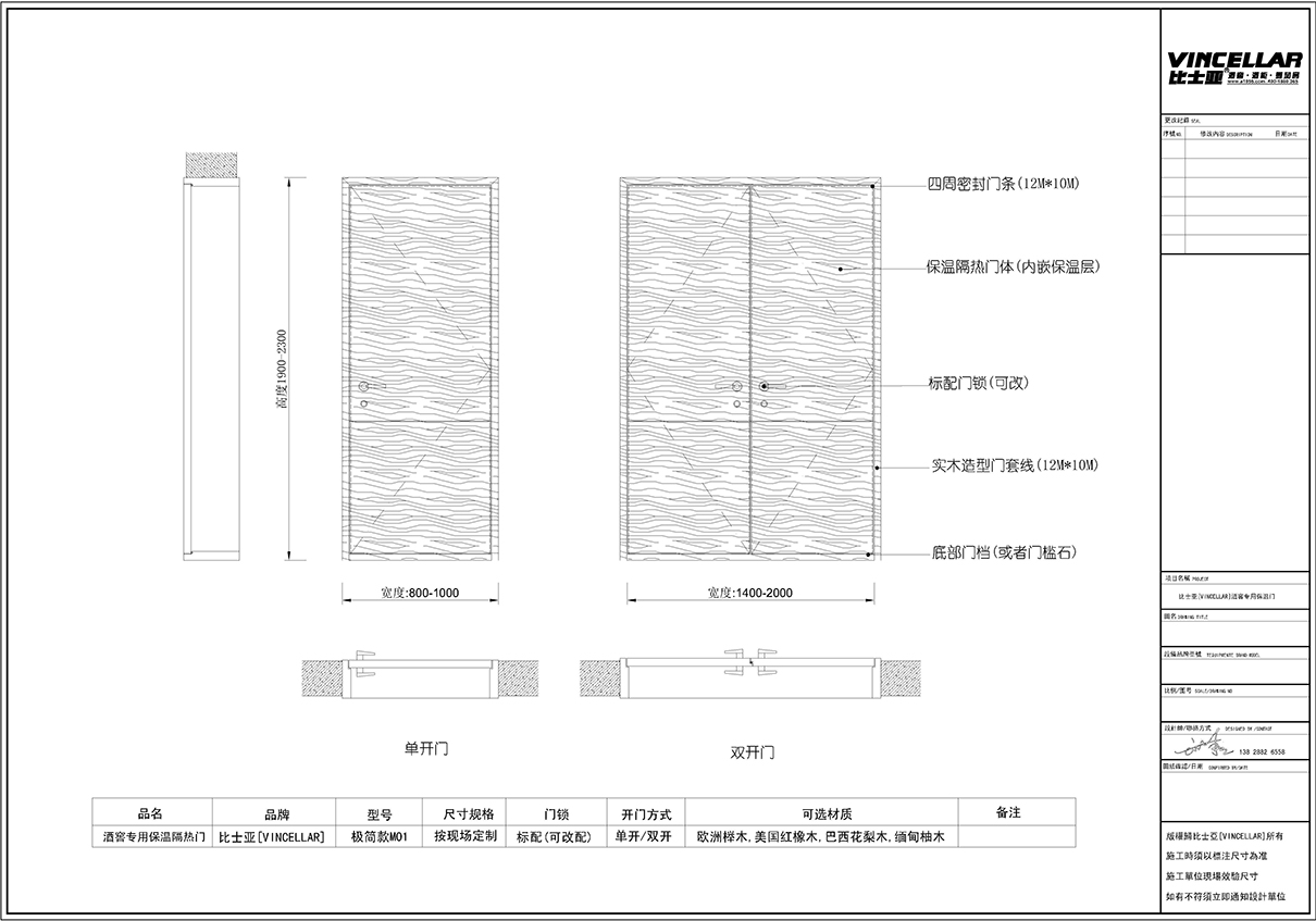 極簡系列全實木酒窖門設(shè)計與做法 極簡系列酒窖專用保溫隔熱門,采用全現(xiàn)場定制模式,門可分為單開門(單開門尺寸:寬度為:800mm-1000mm,高度為:1900mm-2300mm)與雙開門(雙開門尺寸:寬度為:1400mm-2000mm,高度為:1900mm-2300mm),門頁以全實木門內(nèi)嵌40mm厚酒窖專用保溫層,分別以:歐洲櫸木,美國紅橡木,巴西花梨木,緬甸柚木四種材質(zhì)