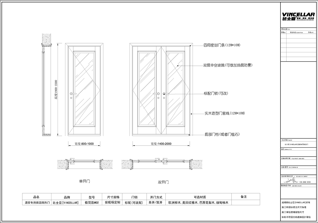 極簡系列透明玻璃酒窖門設(shè)計與做法 極簡系列透明玻璃酒窖專用保溫隔熱門,采用按現(xiàn)場定制模式,門可分為單開門(單開門尺寸:寬度為:800mm-1000mm,高度為:1900mm-2300mm)與雙開門(雙開門尺寸:寬度為:1400mm-2000mm,高度為:1900mm-2300mm),門頁以雙層中空玻璃或者三層中空玻璃上貼隔熱膜防玻璃上掛霧珠,分別以:歐洲櫸木,美國紅橡木,巴西花梨木,緬甸柚木四種材質(zhì)做為外框及門框做法