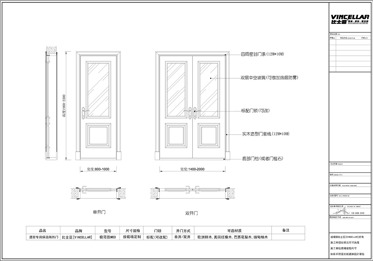 極簡(jiǎn)系列玻木結(jié)合酒窖門設(shè)計(jì)與做法 極簡(jiǎn)系列玻木結(jié)合酒窖專用保溫隔熱門,采用按現(xiàn)場(chǎng)定制模式,門可分為單開(kāi)門(單開(kāi)門尺寸寬度為800mm-1000mm,高度為1900mm-2300mm)與雙開(kāi)門(雙開(kāi)門尺寸寬度為1400mm-2000mm,高度為1900mm-2300mm),門頁(yè)以雙層中空玻璃或者三層中空玻璃上貼隔熱膜防玻璃上掛霧珠,下部分為全實(shí)木內(nèi)嵌保溫層分別以歐洲櫸木,美國(guó)紅橡木,巴西花梨木,緬甸柚木四種材質(zhì)做為外框及門框做法