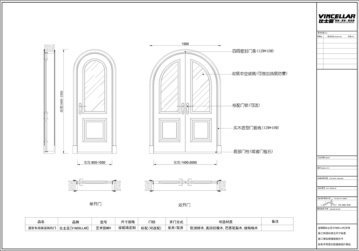 藝術(shù)系列玻木結(jié)合酒窖門尺寸設(shè)計(jì)與做法 藝術(shù)系列玻木結(jié)合酒窖專用保溫隔熱門,采用按現(xiàn)場(chǎng)定制模式,門可分為單開門(單開門尺寸寬度為800mm-1000mm,高度為1900mm-2300mm)與雙開門(雙開門尺寸寬度為1400mm-2000mm,高度為1900mm-2300mm),門頁(yè)以雙層中空玻璃或者三層中空玻璃上貼隔熱膜防玻璃上掛霧珠,下部分為全實(shí)木內(nèi)嵌保溫層分別以歐洲櫸木,美國(guó)紅橡木,巴西花梨木,緬甸柚木四種材質(zhì)做為外框及門框做法