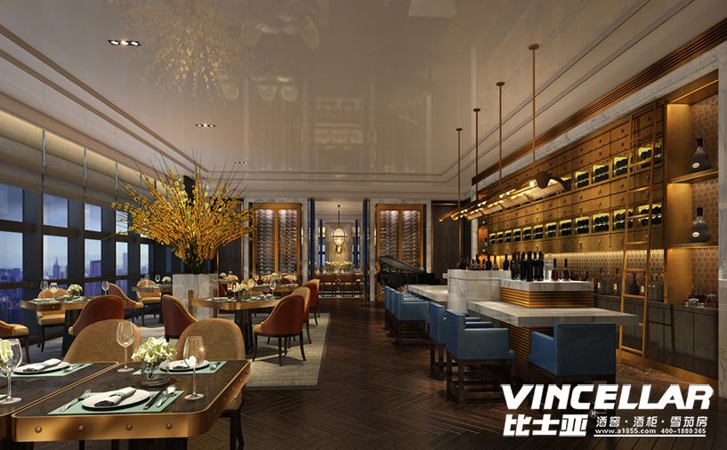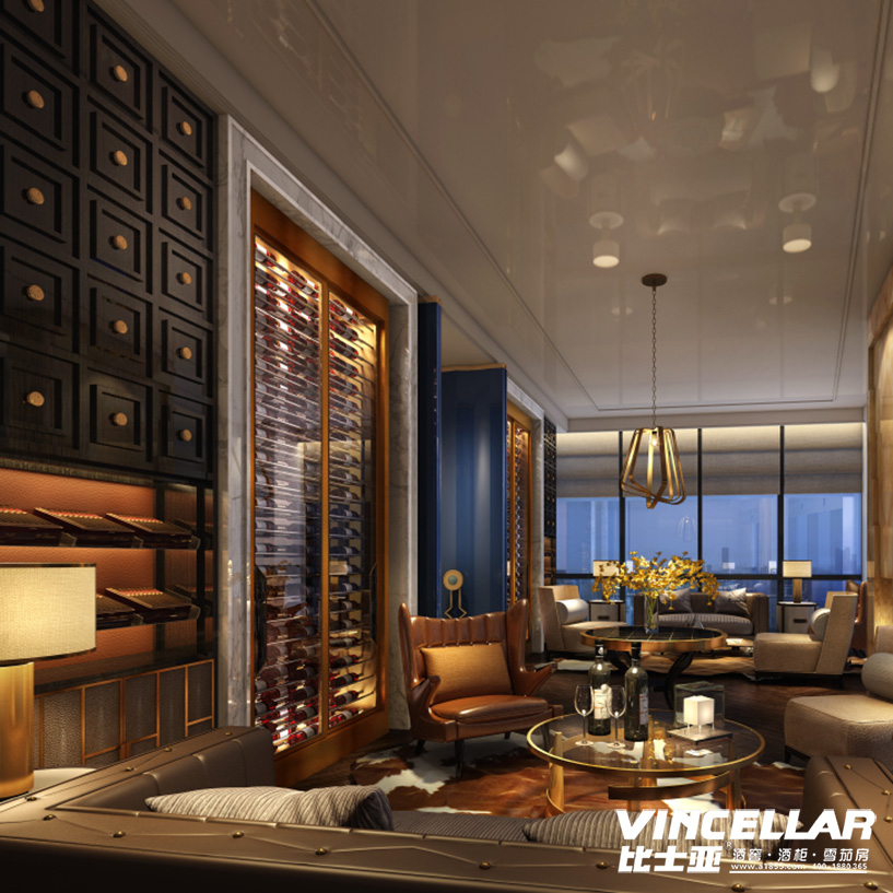 比士亞[VINCELLAR]酒柜設(shè)計定制定做廠家公司設(shè)計的玫瑰金不銹鋼酒柜效果圖,應(yīng)用在私人VIP會所,圖紙分會所區(qū)與VIP區(qū)
