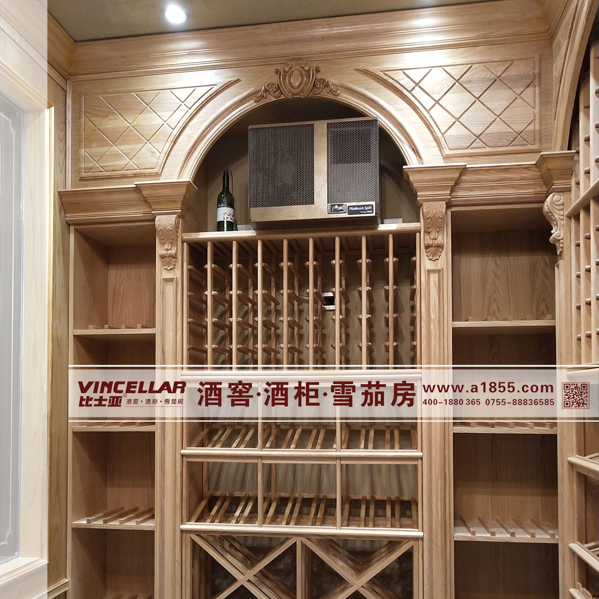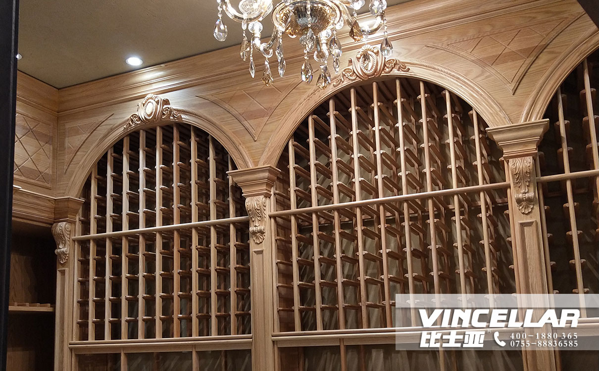 在家裝酒柜定制中?,高雅黑色高光油漆工藝酒柜外框,紅橡木原木制作的家裝酒柜裝修效果圖,給您帶奢華中的而不失的文雅?
