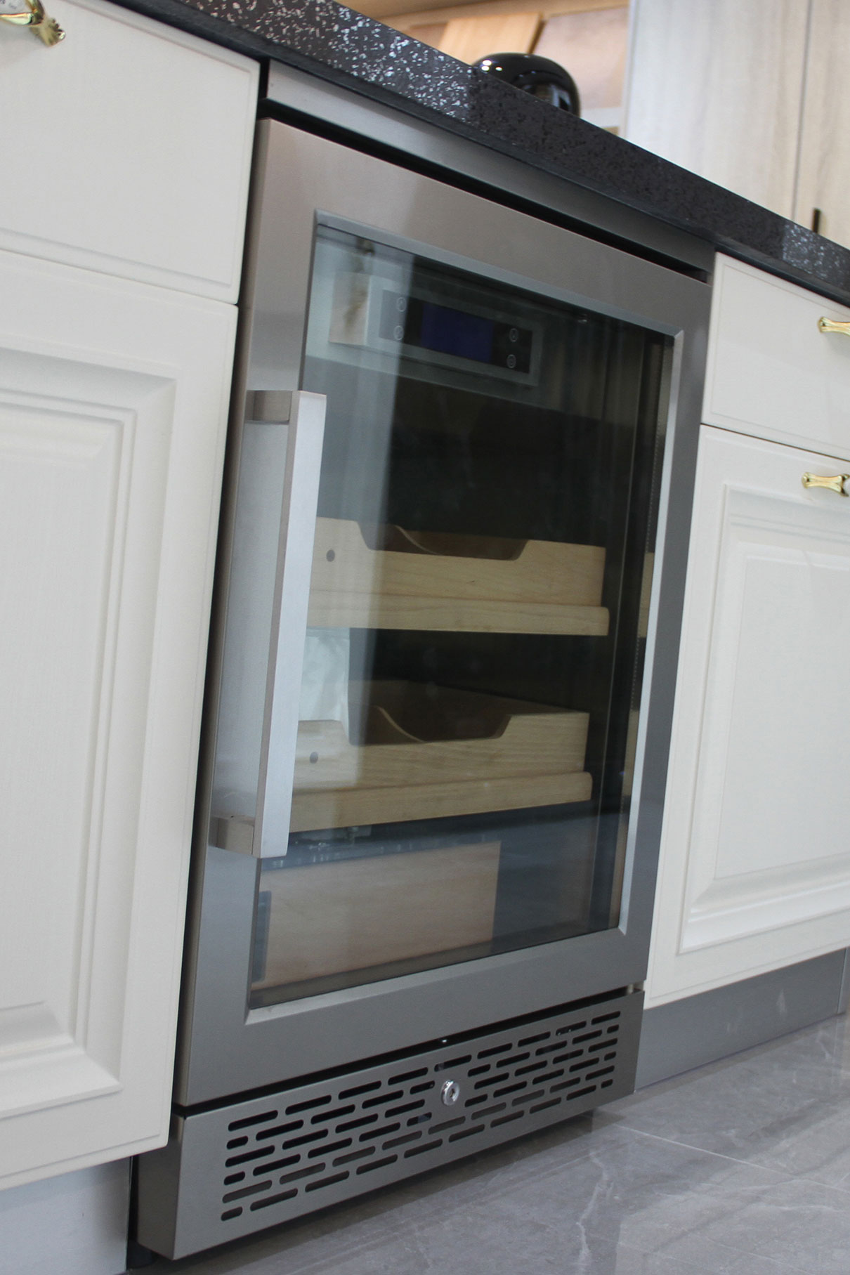 ? ? ? ??嵌入式恒溫紅酒柜,顧名思義,常用于在廚具,家具的搭配中,留出一個空間尺寸,將恒溫紅酒柜嵌入柜體,合理利用空間,這樣的酒柜叫:嵌入式紅酒柜